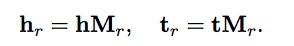 TransR을 수식으로 설명하자면 아래와 같습니다. 먼저 M_r이라는 projection matrix로 entity를 relation space로 projection시킵니다. 그 이후, h+r=t 이라는 기존의 objective를 만족시키는 방향으로 모델 train을 수행합니다.